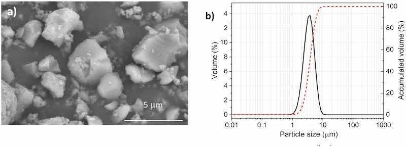 Fig. 1. a) Morphology and b) particle size distribution of micropigments used.